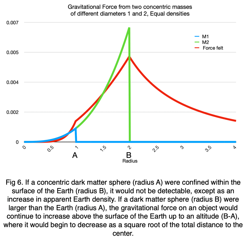 - If our planet includes a dark matter component larger than the diameter of the baryonic Earth, the place to look for local differences in gravitational mass between baryonic matter and dark matter would be an increase in gravitational pull above the Baryonic surface and a deviation from a normal launch trajectory. (See Figure 6.) That is clearly not observed on Earth.