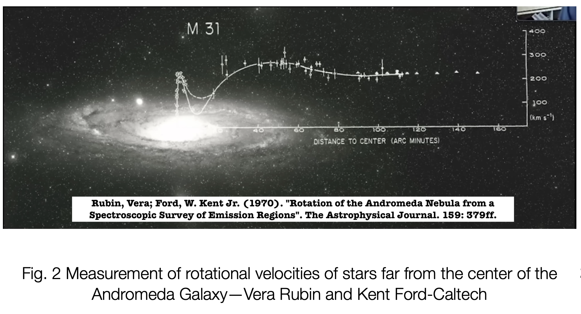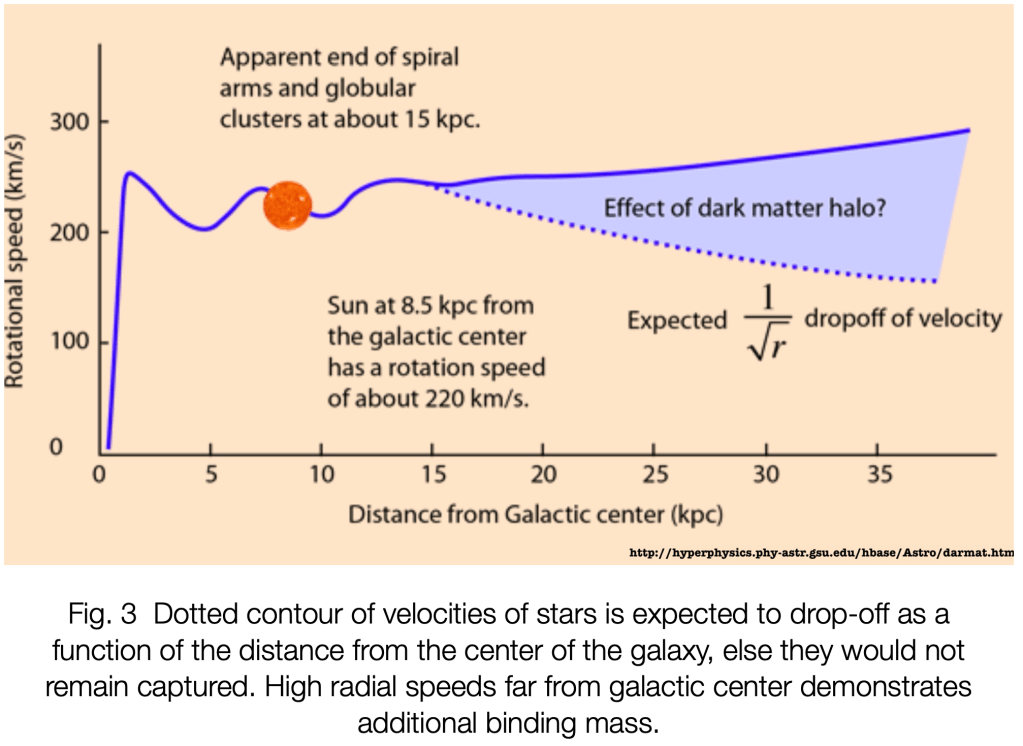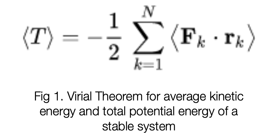 - Fritz Zwicky (Caltech), in a 1933 analysis of distant galaxies, using optical and radio telescopes, spectroscopy, and the implications of the virial theorem, showed that the arms of distant galaxies are spinning at higher rates than should be possible, given the apparent lack of visible gravitational matter holding them intact. The virial theorem ( Fig 1)is a general equation that relates the average over time of the total kinetic energy of a stable system of discrete particles, bound by potential forces, with that of the total potential energy of the system.